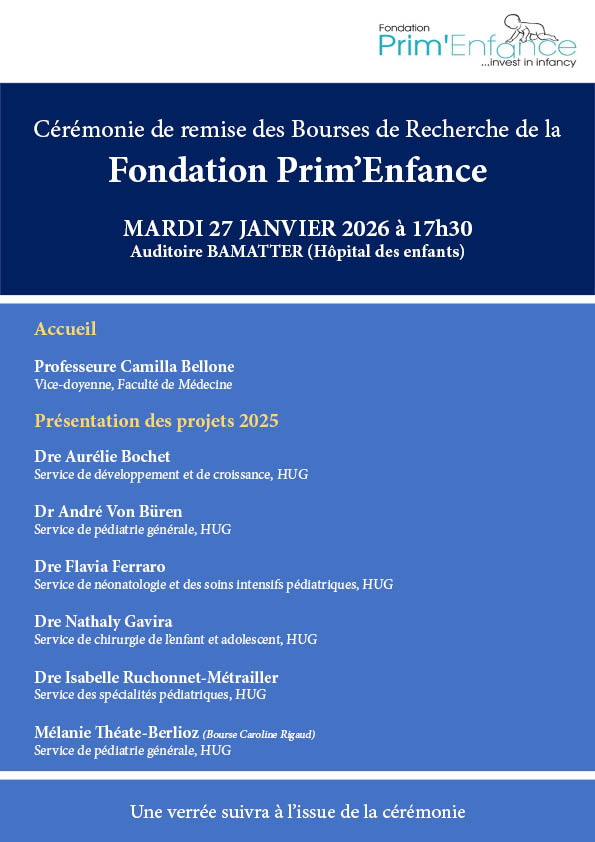 Venez assister à la remise des Bourses de recherche de la Fondation Prim’Enfance, le mardi 27 janvier à 17h30, à l’Auditoire Bamatter (Hôpital des enfants).